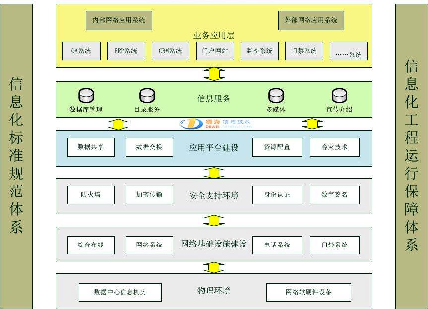 網絡基礎設施向各類信息化應用系統提供必要的網絡基礎環境和可靠、有效的信息傳輸服務通道。如綜合布線、網絡工程等。
