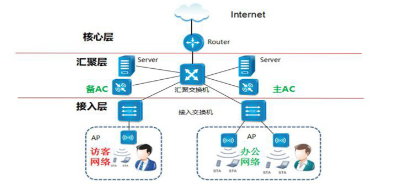 無線網絡的建立是在公司有線網絡之上,進行無線網絡擴充。網絡通過網關提供的網絡出口接入 Internet。